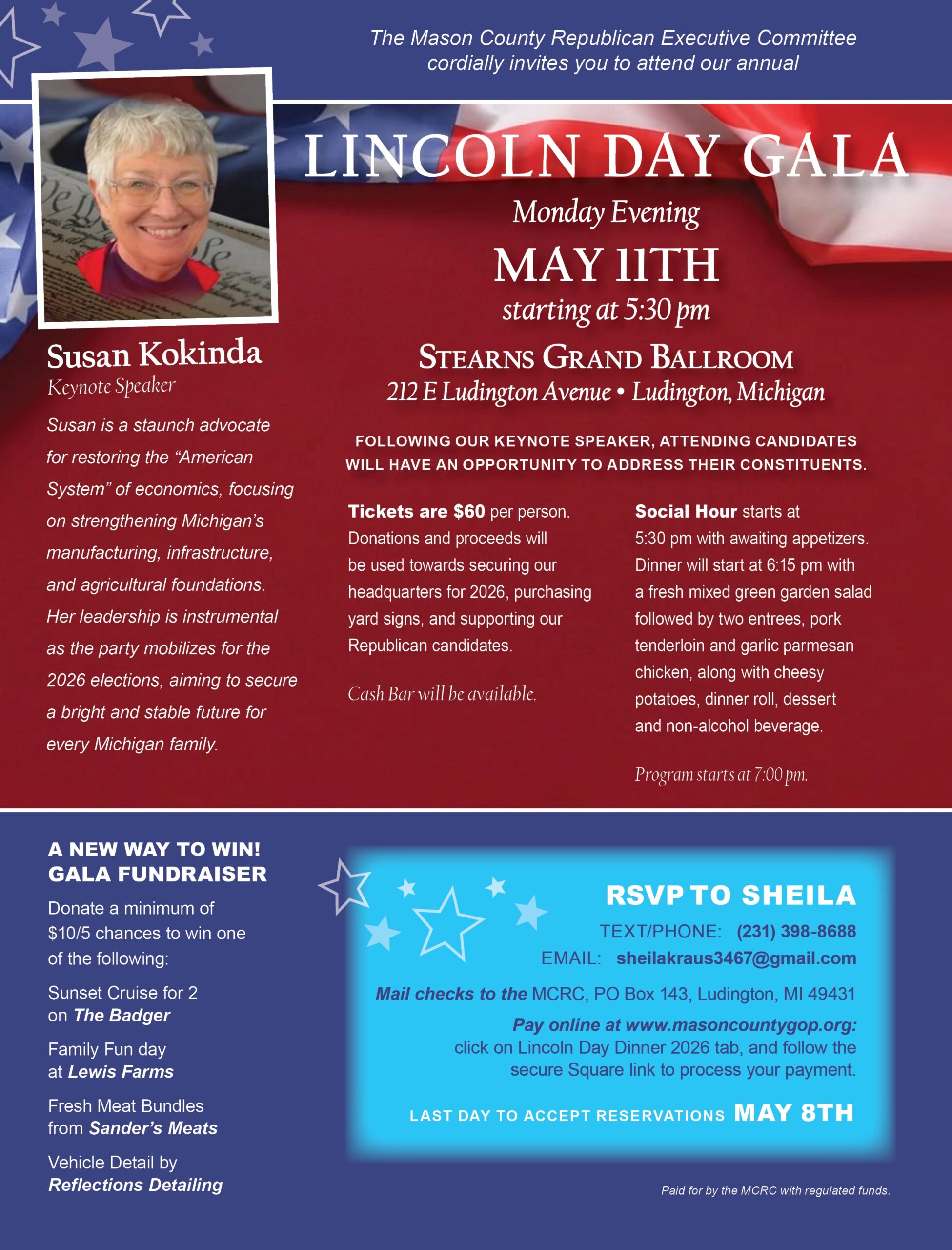 Mail check payable for $60 (per person) to: Mason County Republican Committee, PO Box 143, Ludington, MI 49431